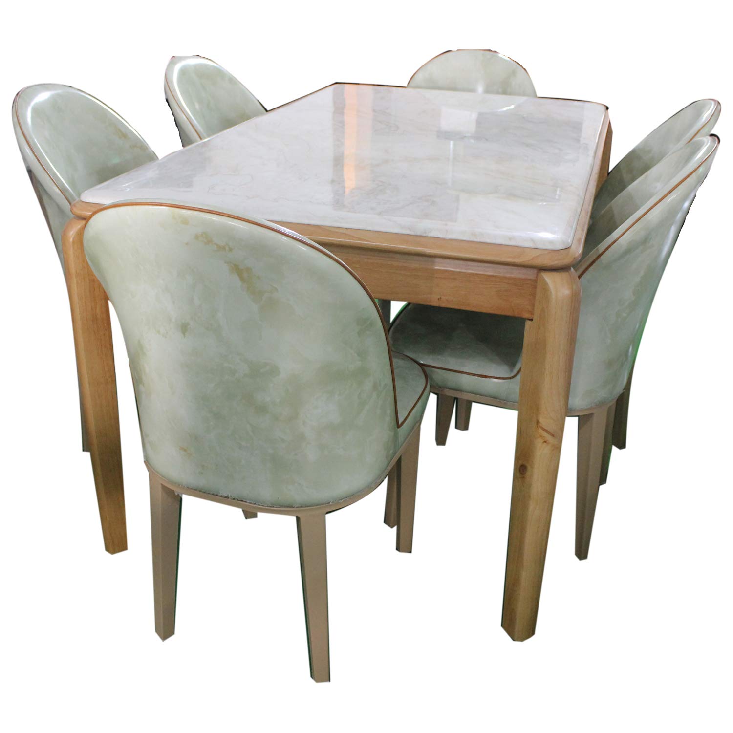 Bianco italian marble 6 seater dining table and it's base is designed with golden beat and light blue clolor